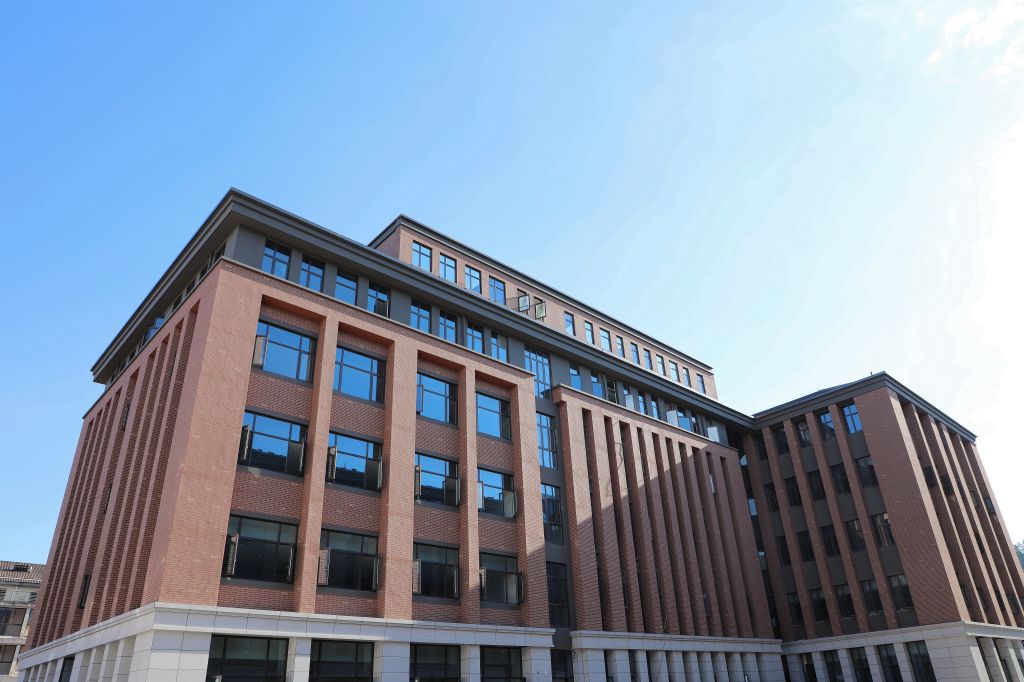 紅墻褐頂的新農科大樓在藍天白云的映襯下,