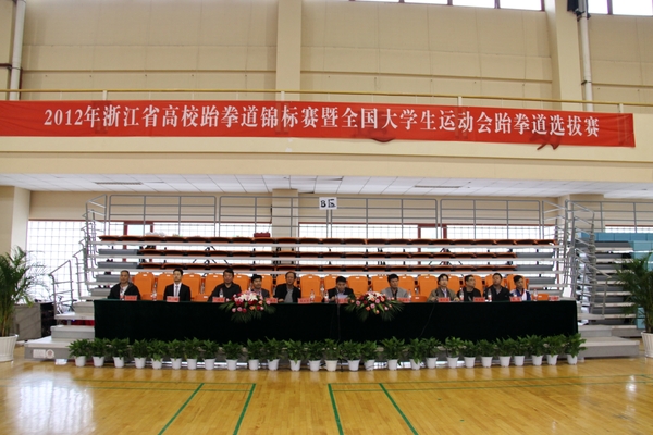 我校副校長張立欽,省教育廳體衛(wèi)處秘書長徐建津,浙江省大學(xué)生體育協(xié)會副秘書長、武術(shù)分會主席蘇亞平等有關(guān)領(lǐng)導(dǎo)和各代表隊(duì)領(lǐng)隊(duì)、教練員、裁判員、運(yùn)動員等400余人參加了開幕式。