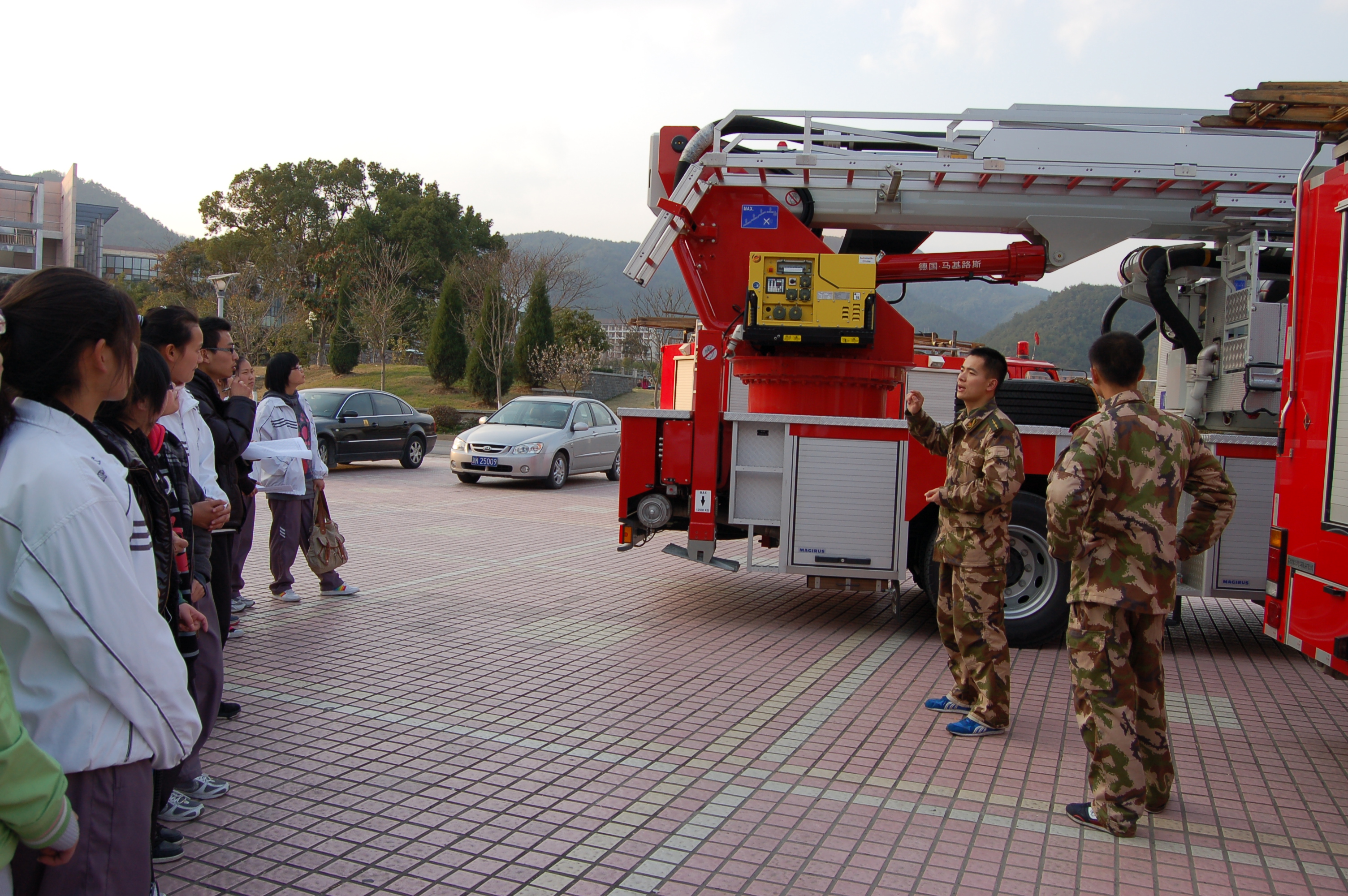 臨安消防大隊中隊長謝濟濤在東湖食堂門口為同學(xué)們講解五輛消防車的各種功能,并演示相關(guān)的使用方法。信息工程學(xué)院電子信息103班團支部現(xiàn)場開展了防火知識的知識競答活動,路過食堂的同學(xué)們紛紛參與進(jìn)來,并在紅色條幅上聯(lián)合簽名,寫下自己對防火行為的承諾。