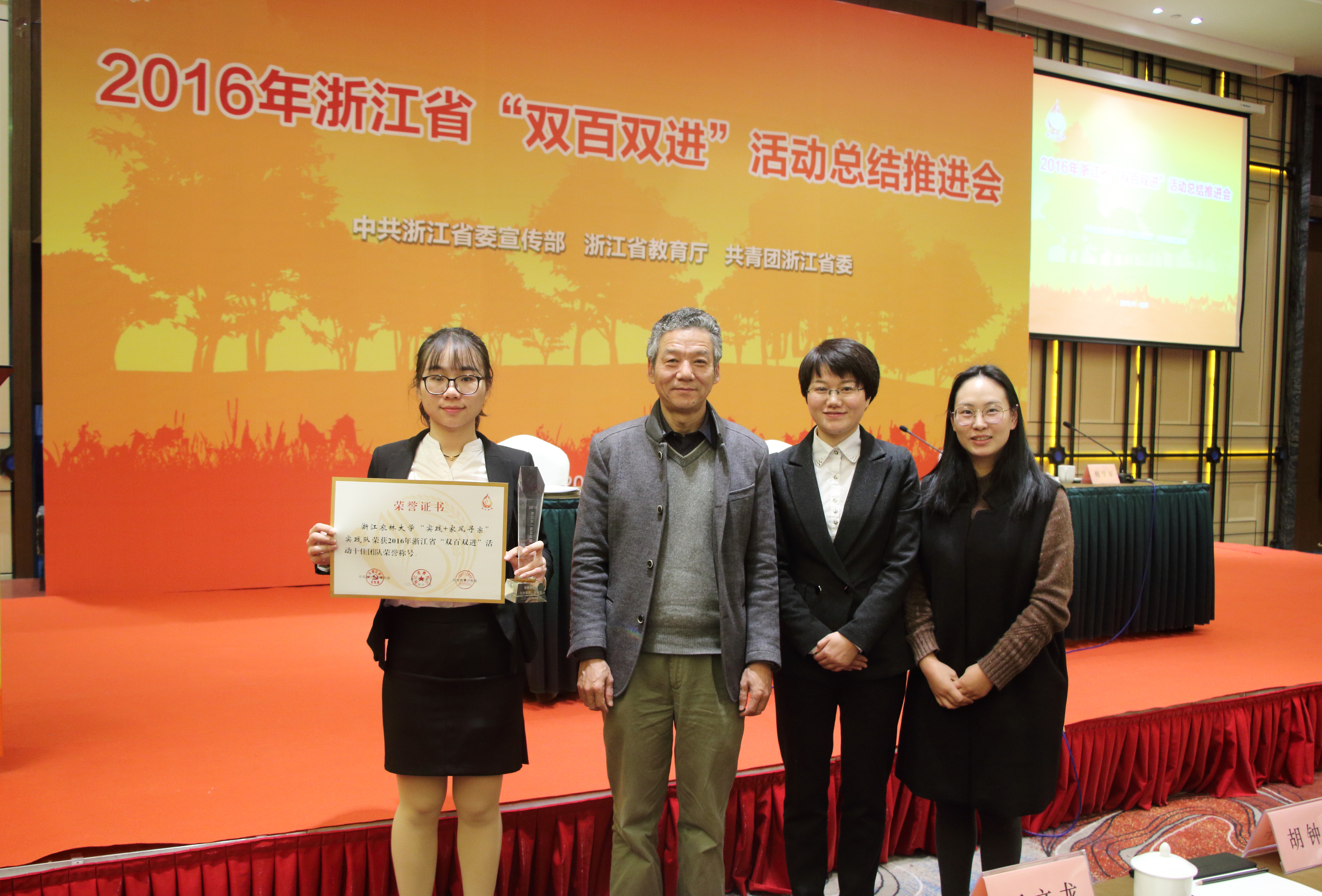 11月30日,由省委宣傳部、省教育廳、團(tuán)省委聯(lián)合舉辦的浙江省2016年“雙百雙進(jìn)”活動總結(jié)推進(jìn)會在杭舉行,我校“家風(fēng)·尋蹤”大學(xué)生暑期社會實(shí)踐團(tuán)獲得“十佳團(tuán)隊(duì)”榮譽(yù)稱號。副校長王自勇受邀參加會議。