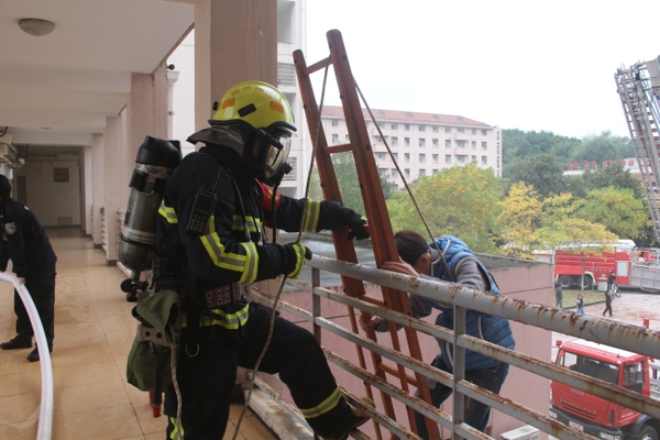 現場模擬學生宿舍發生火災,公寓值班員立即撥打“校園110”報警電話,指揮中心立即啟動浙江農林大學應急預案,迅速調集校志愿消防隊員趕赴“火災現場”開展滅火、疏散。被困學生在樓宇疏散引導員的指導下用濕毛巾捂住口、鼻,彎著腰,沿墻角、樓梯有序撤離。