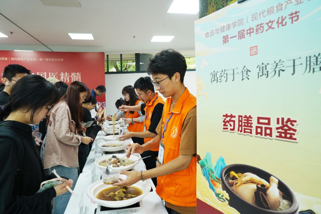 鴻運當頭、仙草老鴨煲、金玉滿堂、蟲草土雞煲、龍銜牛柳、逍遙爆蝦、洛神醋魚、八寶如意……這兩天,在浙江農林大學舉行的首屆中藥文化節上,該校首次推出的迎端午藥膳八大碗,受到了數百名師生爭先品嘗。