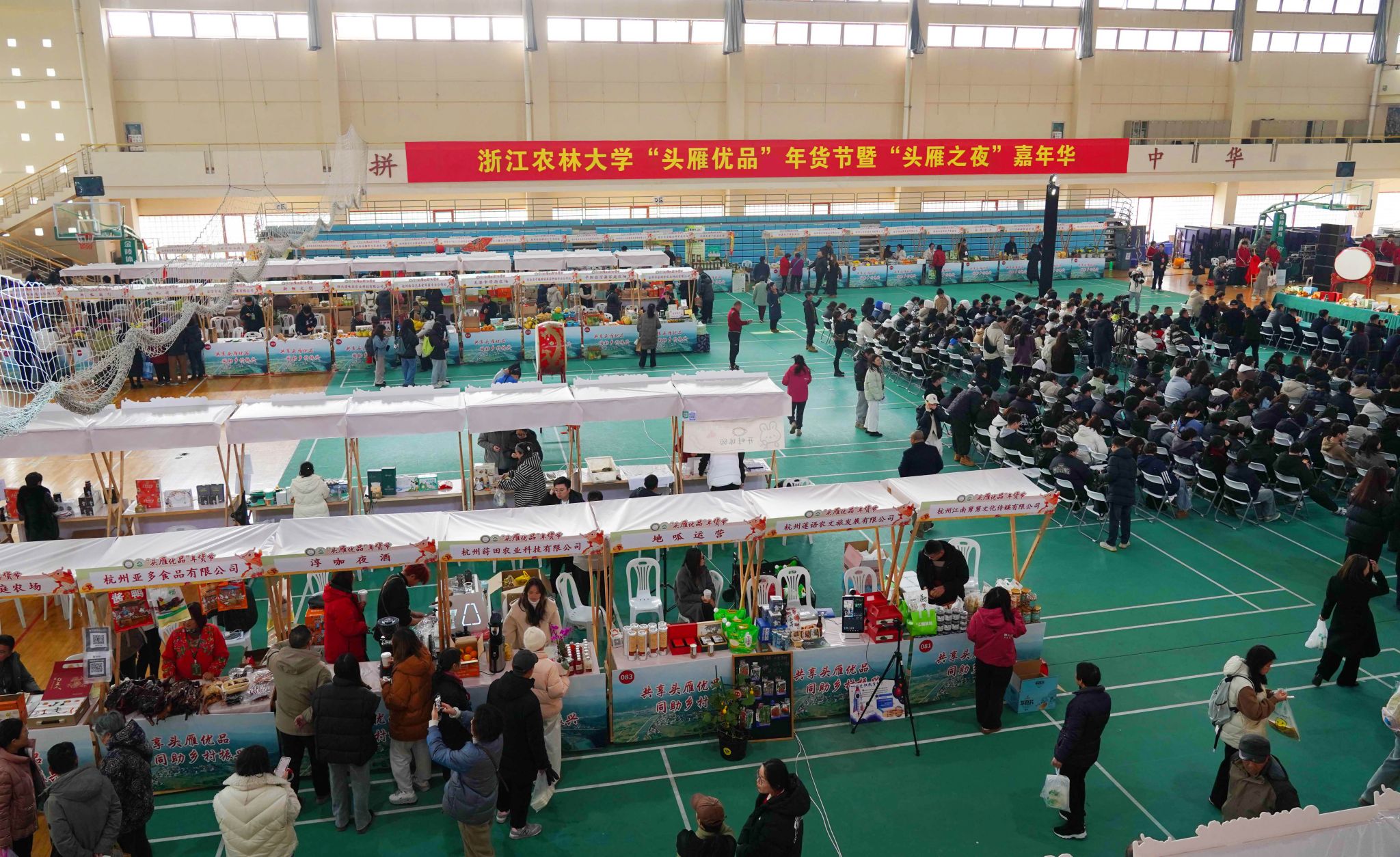今天開張的浙江農林大學“頭雁優品”年貨節熱鬧非凡。128家“頭雁”企業和“農創客”們帶去了500多種特色農副產品,該校的教師團隊自主研發的科技成果也頗受歡迎。現場分為美食區、科研產品區、農事體驗區、蔬果區、綜合區等5個區塊,吸引了數以千計的師生、市民前往選購。