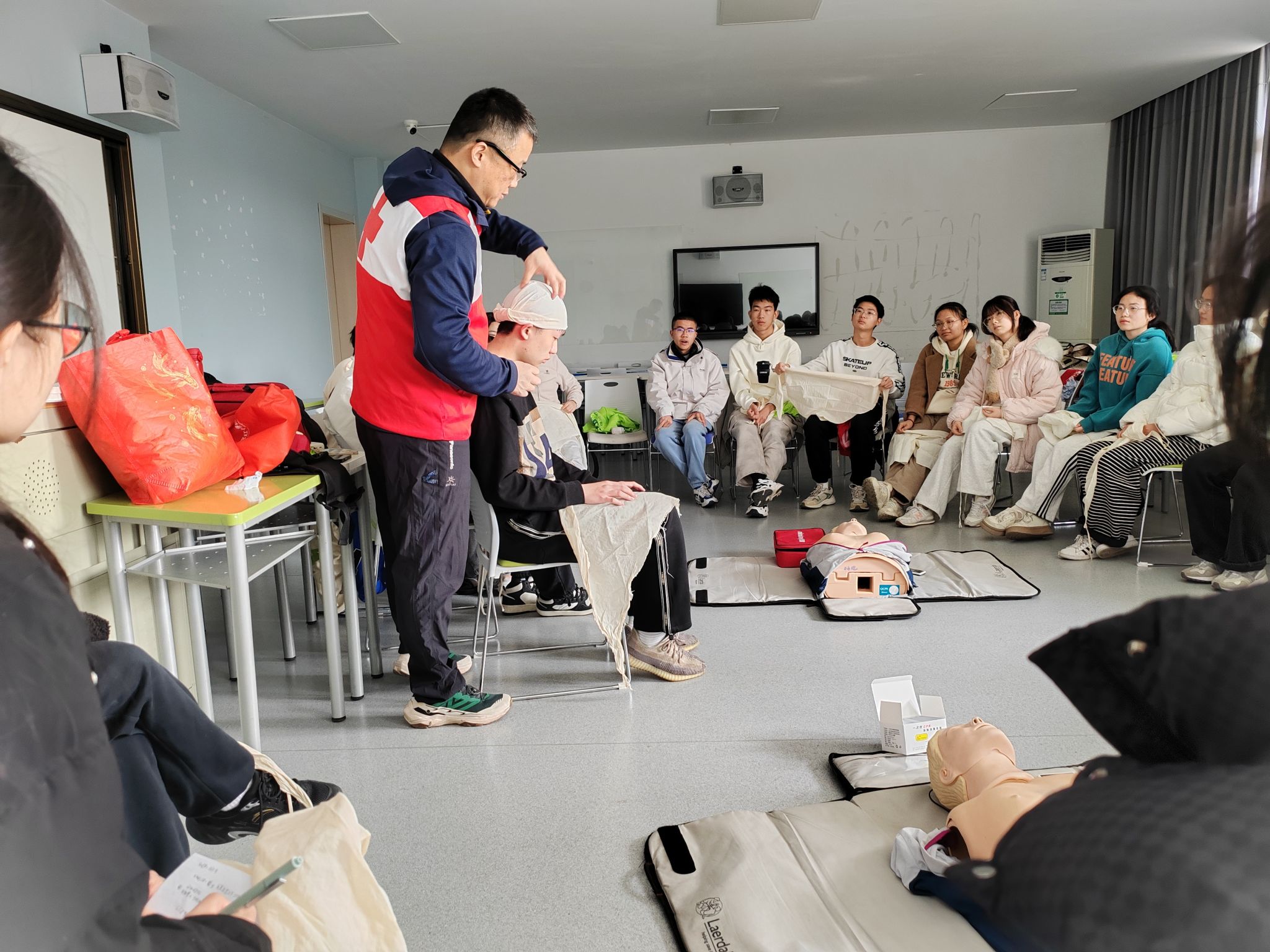 培訓內容涵蓋理論講解與實踐操作兩部分。理論培訓環節,專業講師詳細介紹了心肺復蘇具體的按壓頻率、按壓深度、人工呼吸的時間以及各方面注意事項;細致講解了各類受傷出血情況用到的環形、螺旋、八字等包扎方法;詳細講述了不同骨折部位如何固定。志愿者們全神貫注,認真汲取知識。