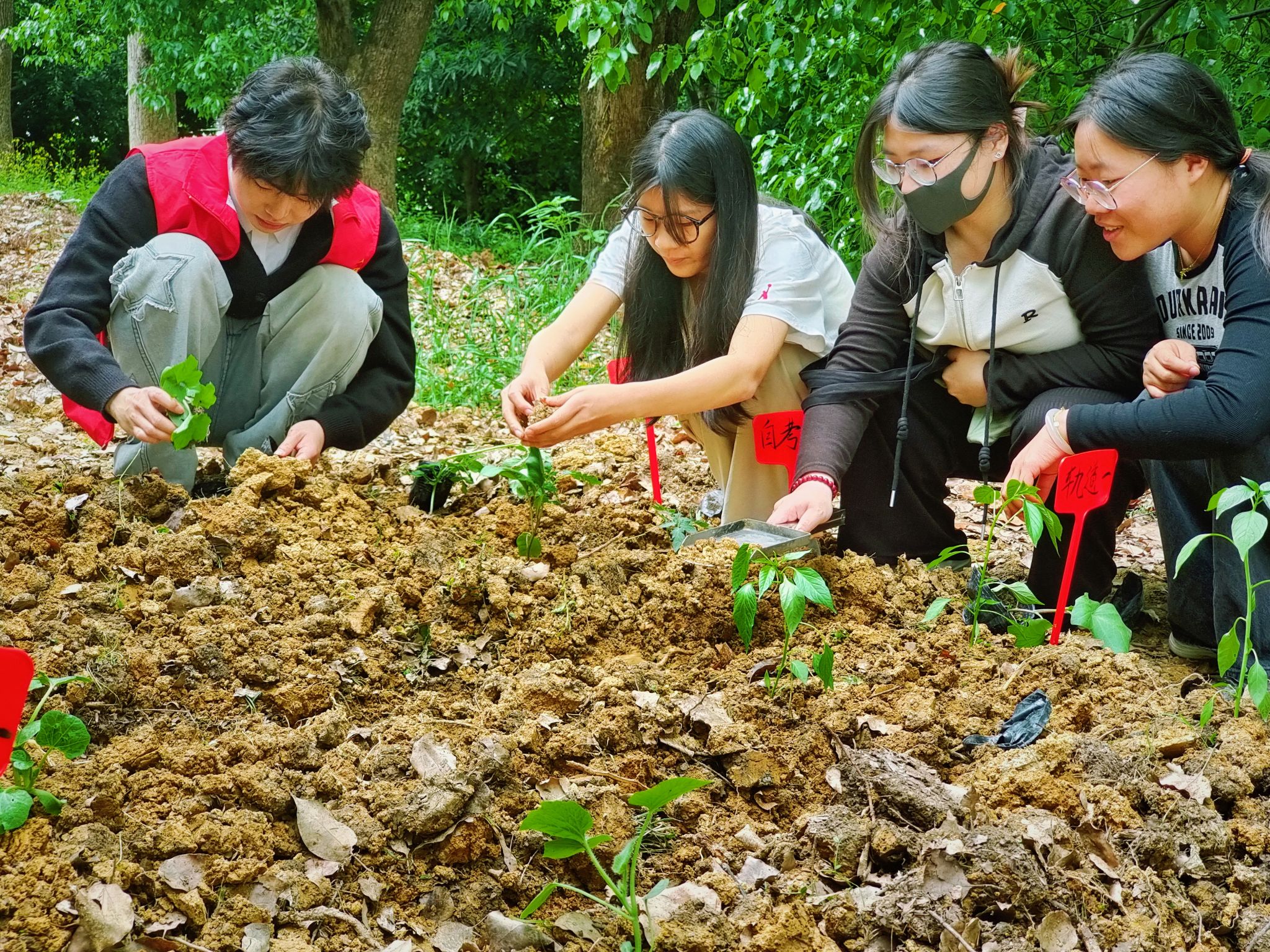 活動以“立體課堂”為設計理念:理論環節中以圖文形式講解常見植物特性、藥用價值,帶領學生認識艾草、半夏、魚腥草等本草植物的形態特征與藥食價值,將抽象知識轉化為可感知的生活應用場景;實踐環節則將校園綠地化為“競技賽場”,分組在限定區域內通過葉片辨識、氣味捕捉等方式完成植物速認挑戰;最后在種植體驗區完成植物的栽培全流程,從翻土的力度把控到播種的間距考量,均體現對植物生長規律的實踐認知。