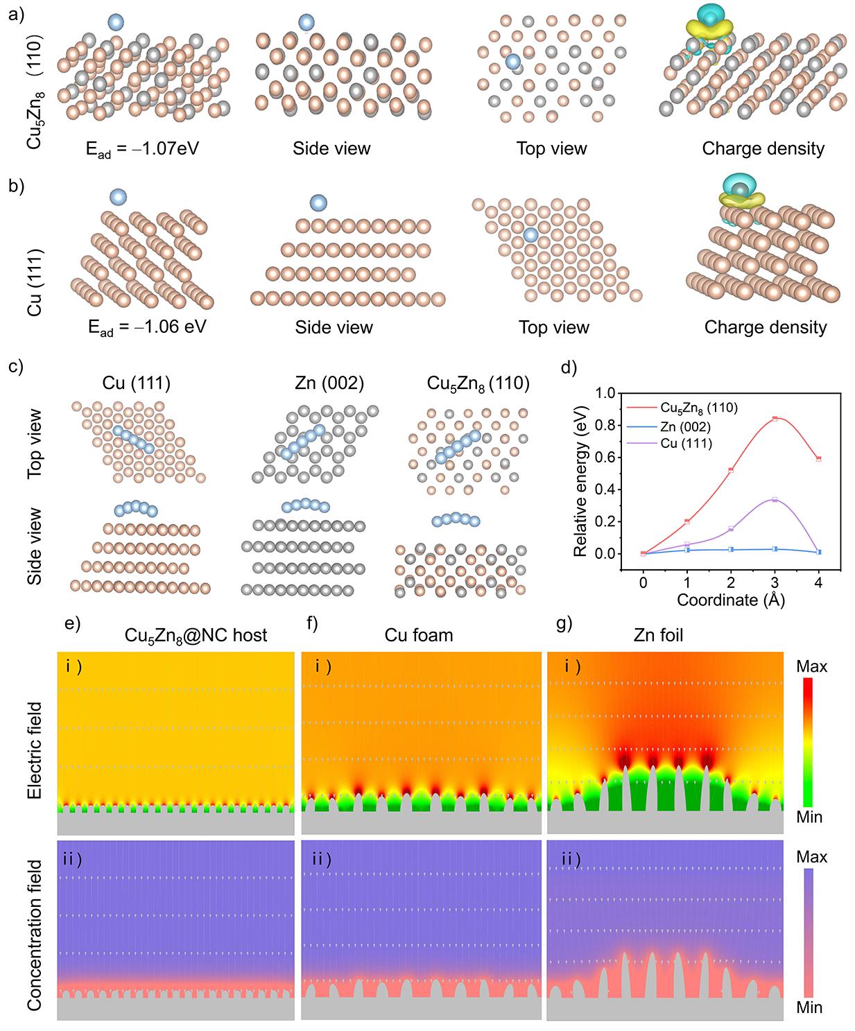 DFT理論計算展示鋅原子在Cu5Zn8表面的吸附能為–1.07 eV,說明這種合金組分可以作為親鋅位點進行優先成核,并在電場驅動下促進“自內向外”的鍍鋅過程。差分電荷密度再次表明鋅在Cu5Zn8表面上存在比銅金屬更為明顯的電荷轉移。此外,理論計算模擬了鋅分別在Zn (002)、Cu (111)和Cu5Zn8 (110)晶面上相鄰能量最小值的擴散路徑。計算得到的Cu5Zn8擴散能壘為0.84 eV,遠高于純Zn(0.03 eV)和Cu(0.34 eV),證明合金有利于鋅離子的沉積固定。有限元模擬結果表明,Cu5Zn8@NC有望均勻局部電場和濃度場分布,促進電極/電解液的充分接觸。