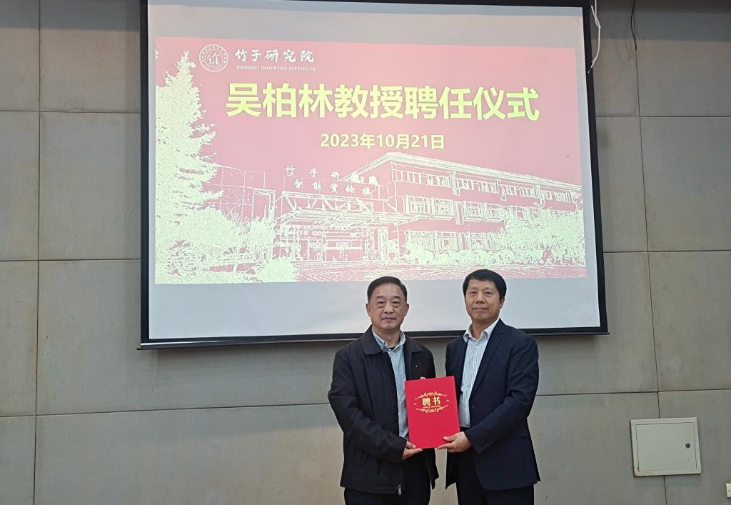 方偉為吳柏林頒發了聘書,并對吳柏林的加盟表示了熱烈歡迎和衷心感謝。他表示,吳柏林的加盟將有力提升竹子研究院師資隊伍水平,在提升社會服務水平及擴大社會影響力上發揮積極作用,促使學科交叉、三產融合,更好服務竹產業轉型升級,促進竹產業高質量發展。