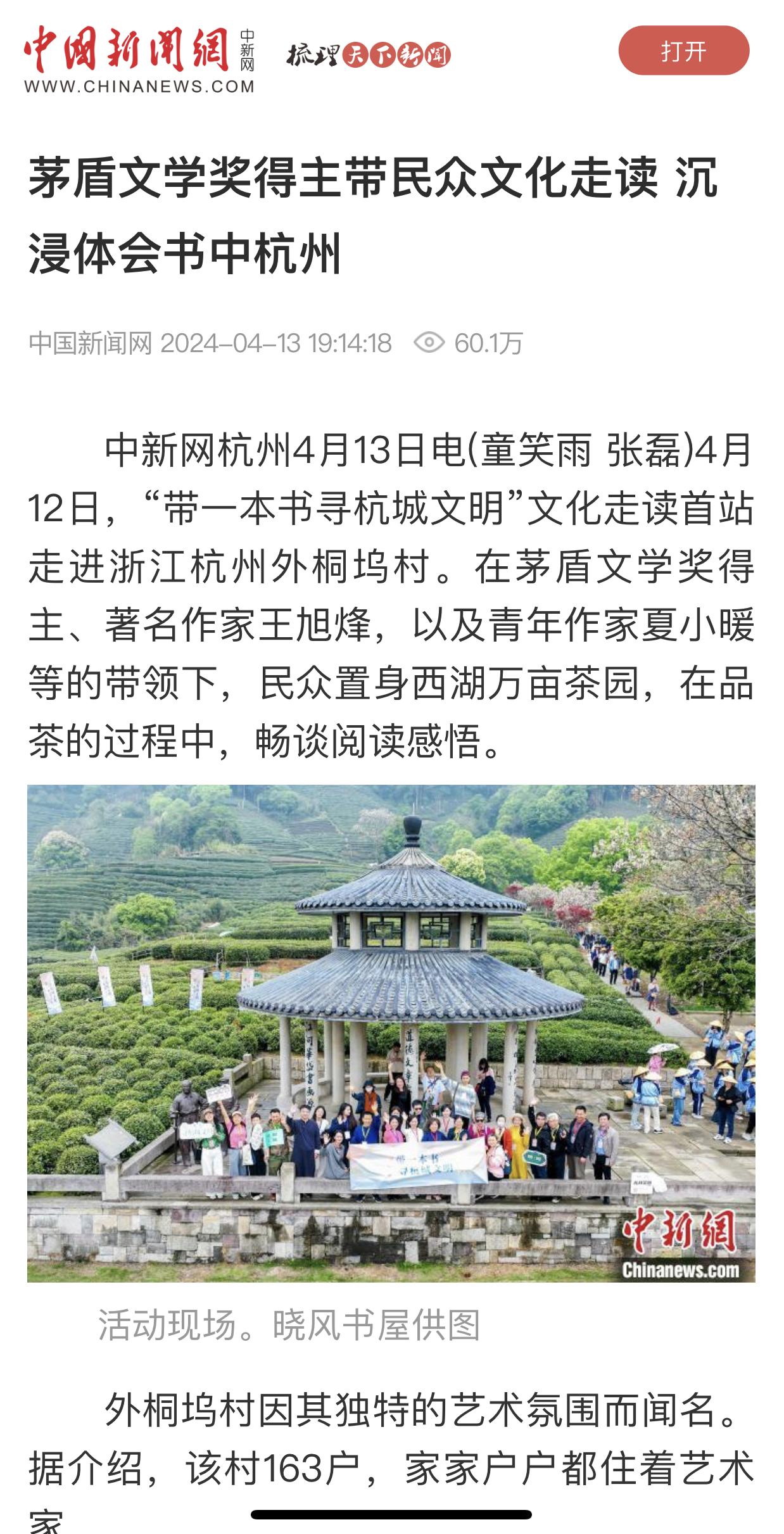中國新聞網對這次活動進行了詳盡的報道,不僅展現了王旭烽教授作為杭州文化名人的卓越成就,還賦予了“帶一本書尋杭城文明”活動以深遠的意義。文化走讀活動,讓更多的人在閱讀中尋找到杭州的文化根脈,共同為傳承和弘揚中華優秀傳統文化貢獻力量。