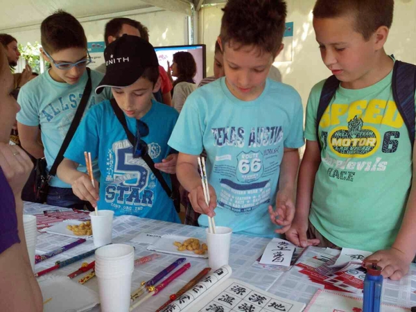 體驗區的活動設計注重學生的參與和互動,成了整個科技節參與人數最多、最為火爆的區塊之一。用筷子夾花生比賽,讓學生們有機會學習如何使用筷子,“夾花生大賽”的勝利者還可以得到意外的驚喜---漢辦所贈學習中文的書簽,讓他們愛不釋手,充分享受到了中國筷子競技的樂趣。而現場最為火爆的活動當屬中國書法贈中文名了。志愿者老師們輪番上陣,馬不停蹄地為前來的學生市民們用毛筆寫下他們的中文名字,場面歡愉而又溫馨。據不完全按統計,2天一共為3500多學生書寫了中文名字,受到了組織方和廣大學生市民的高度贊譽。