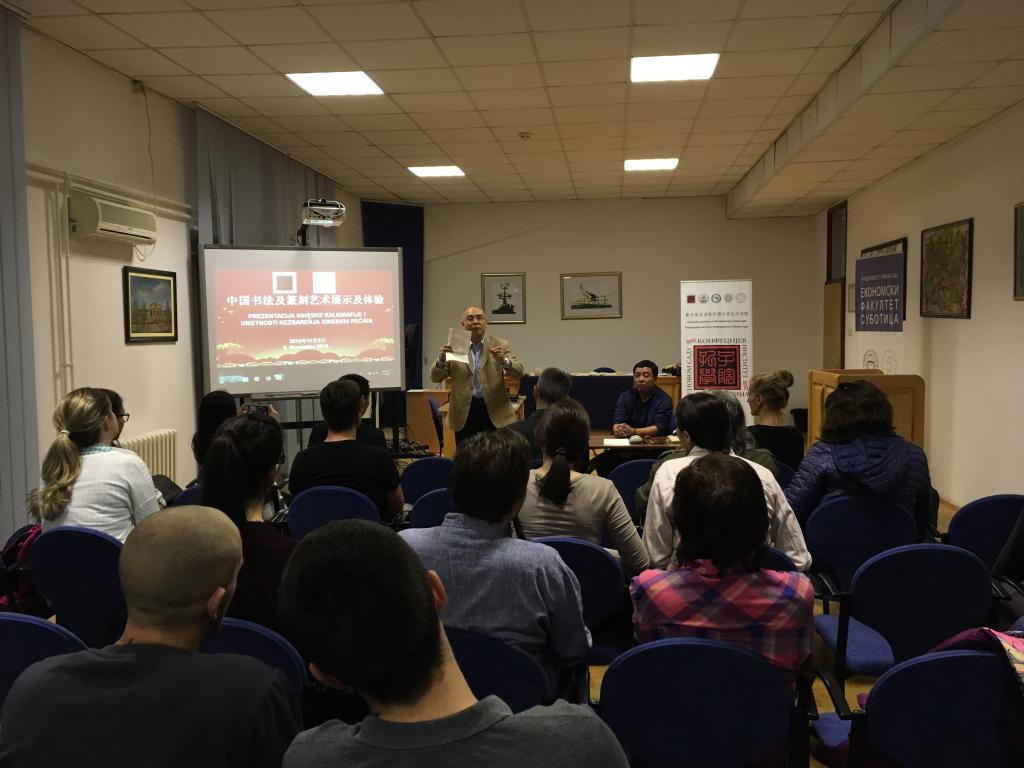 在諾大經濟學院的體驗活動中,經濟學院副院長湯姆斯拉夫·蘇達萊維奇(TomislavSudarevic)教授說:“我剛從中國參加學術會議回來,非常感謝兩位藝術家不辭辛苦來到蘇博蒂察,讓我們有機會領略到中國的神奇悠久的書法篆刻藝術,真誠感謝合作單位諾大孔院對經濟學院師生學習漢語、了解中國文化需求的熱誠關注及和私幫助。”